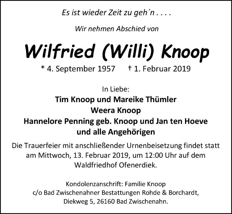 Hier finden Sie alle Traueranzeigen aus der Zeitung, die bisher für Wilfried Knoop erschienen sind. Weitere Traueranzeigen, die in der Zeitung erscheinen, werden hier ebenfalls aufgelistet