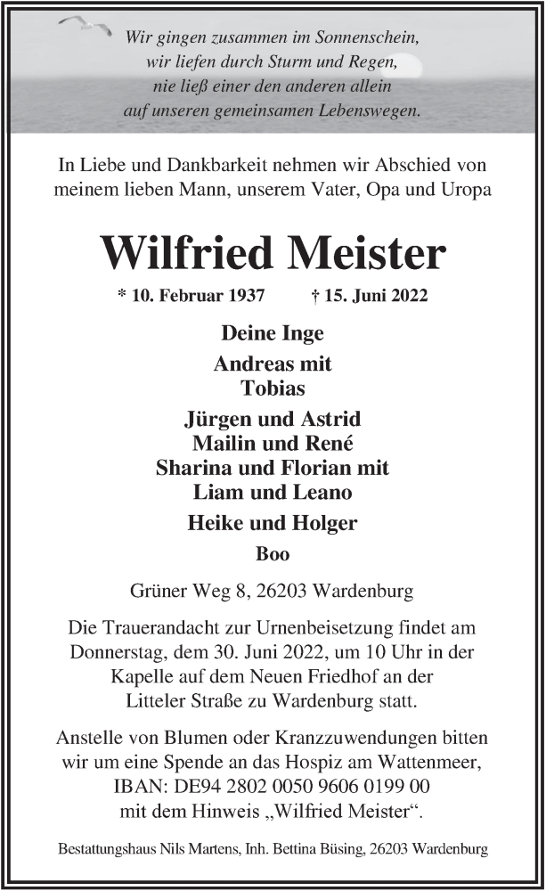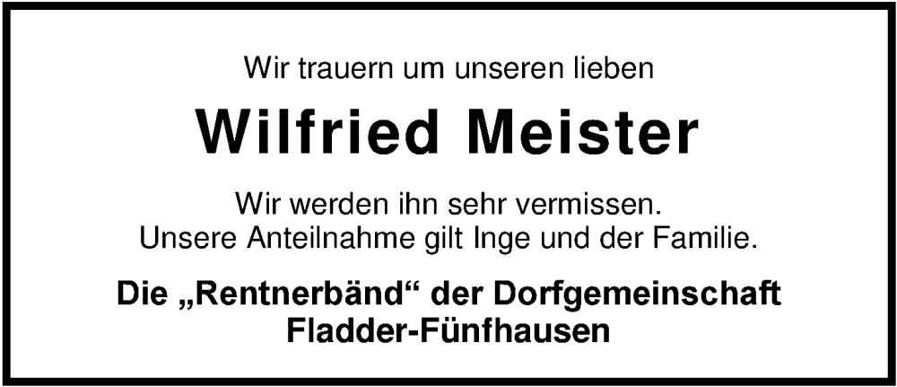 Hier finden Sie alle Traueranzeigen aus der Zeitung, die bisher für Wilfried Meister erschienen sind. Weitere Traueranzeigen, die in der Zeitung erscheinen, werden hier ebenfalls aufgelistet