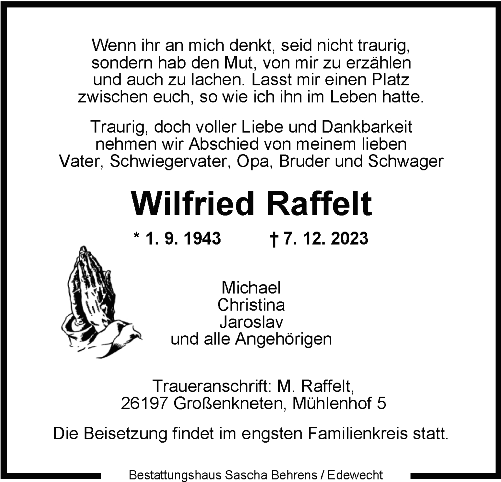 Hier finden Sie alle Traueranzeigen aus der Zeitung, die bisher für Wilfried Raffelt erschienen sind. Weitere Traueranzeigen, die in der Zeitung erscheinen, werden hier ebenfalls aufgelistet