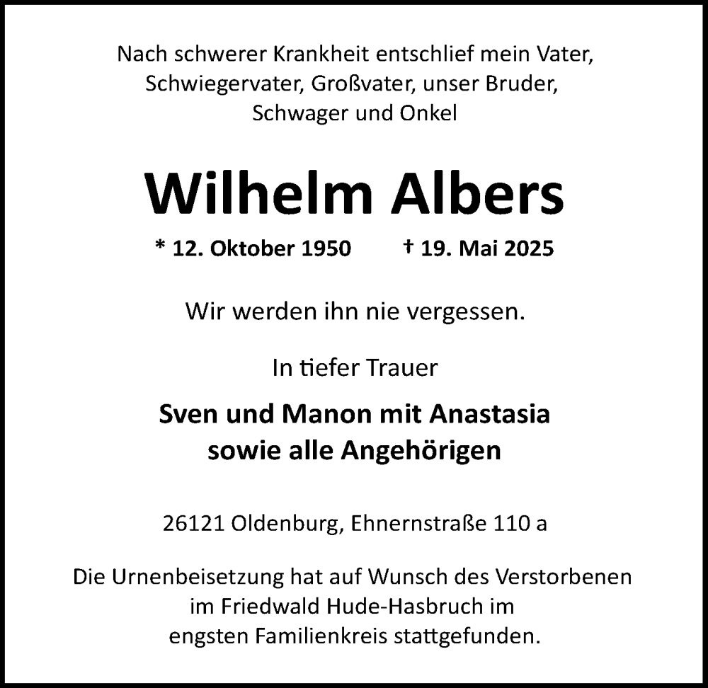 Hier finden Sie alle Traueranzeigen aus der Zeitung, die bisher für Wilhelm Albers erschienen sind. Weitere Traueranzeigen, die in der Zeitung erscheinen, werden hier ebenfalls aufgelistet