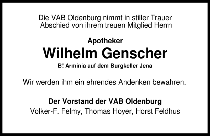 Hier finden Sie alle Traueranzeigen aus der Zeitung, die bisher für Wilhelm Genscher erschienen sind. Weitere Traueranzeigen, die in der Zeitung erscheinen, werden hier ebenfalls aufgelistet