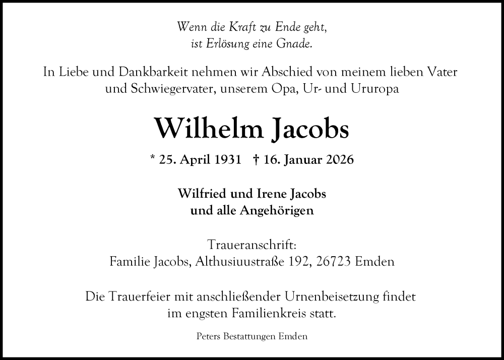 Hier finden Sie alle Traueranzeigen aus der Zeitung, die bisher für Wilhelm Jacobs erschienen sind. Weitere Traueranzeigen, die in der Zeitung erscheinen, werden hier ebenfalls aufgelistet