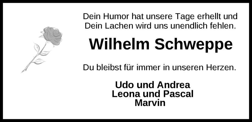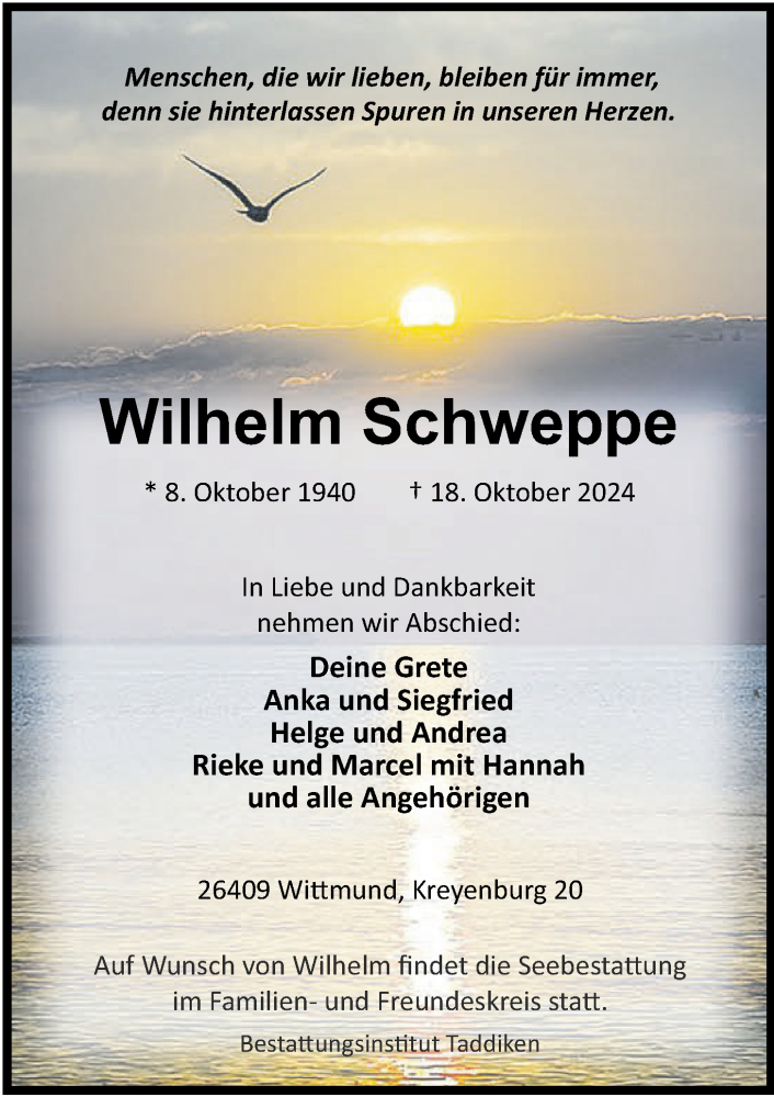 Hier finden Sie alle Traueranzeigen aus der Zeitung, die bisher für Wilhelm Schweppe erschienen sind. Weitere Traueranzeigen, die in der Zeitung erscheinen, werden hier ebenfalls aufgelistet