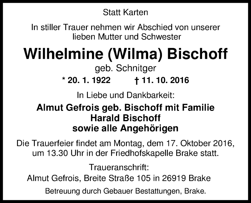 Hier finden Sie alle Traueranzeigen aus der Zeitung, die bisher für Wilhelmine (Wilma) Bischoff erschienen sind. Weitere Traueranzeigen, die in der Zeitung erscheinen, werden hier ebenfalls aufgelistet