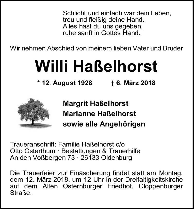 Hier finden Sie alle Traueranzeigen aus der Zeitung, die bisher für Willi Haßelhorst erschienen sind. Weitere Traueranzeigen, die in der Zeitung erscheinen, werden hier ebenfalls aufgelistet