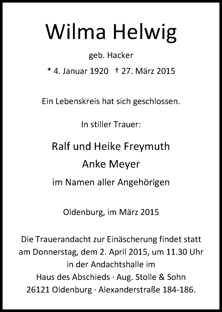 Hier finden Sie alle Traueranzeigen aus der Zeitung, die bisher für Wilma Helwig erschienen sind. Weitere Traueranzeigen, die in der Zeitung erscheinen, werden hier ebenfalls aufgelistet