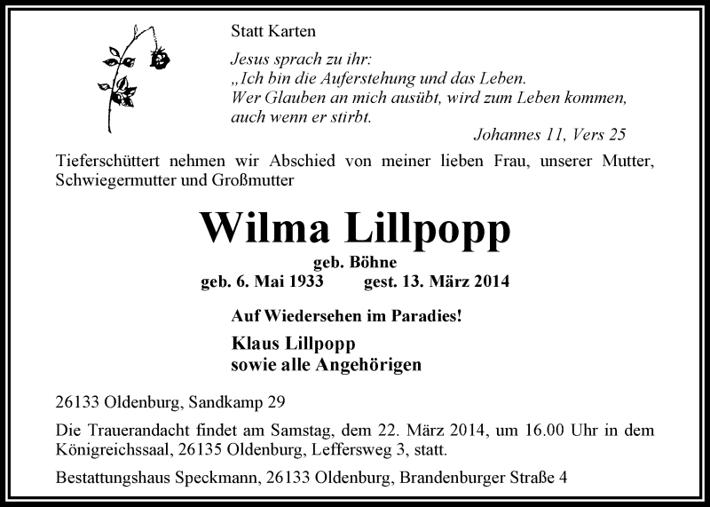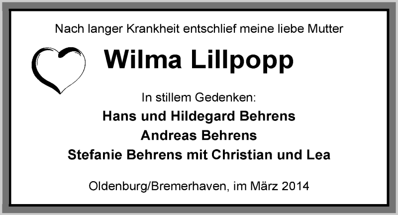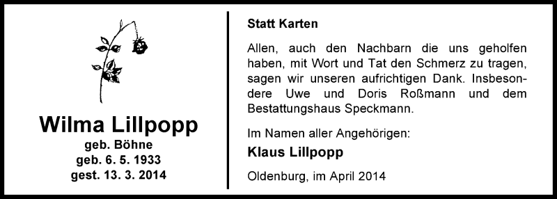 Hier finden Sie alle Traueranzeigen aus der Zeitung, die bisher für Wilma Lillpopp erschienen sind. Weitere Traueranzeigen, die in der Zeitung erscheinen, werden hier ebenfalls aufgelistet