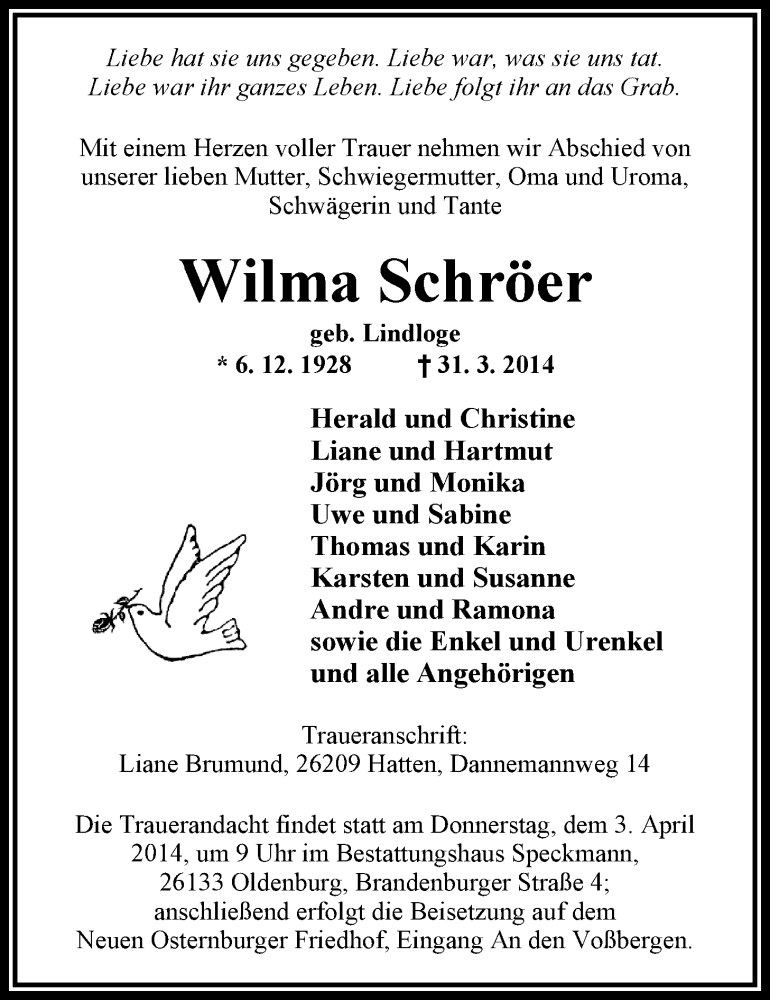 Hier finden Sie alle Traueranzeigen aus der Zeitung, die bisher für Wilma Schröer erschienen sind. Weitere Traueranzeigen, die in der Zeitung erscheinen, werden hier ebenfalls aufgelistet