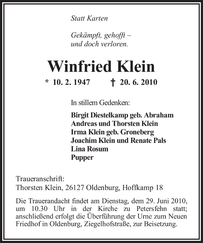 Hier finden Sie alle Traueranzeigen aus der Zeitung, die bisher für Winfried Klein erschienen sind. Weitere Traueranzeigen, die in der Zeitung erscheinen, werden hier ebenfalls aufgelistet