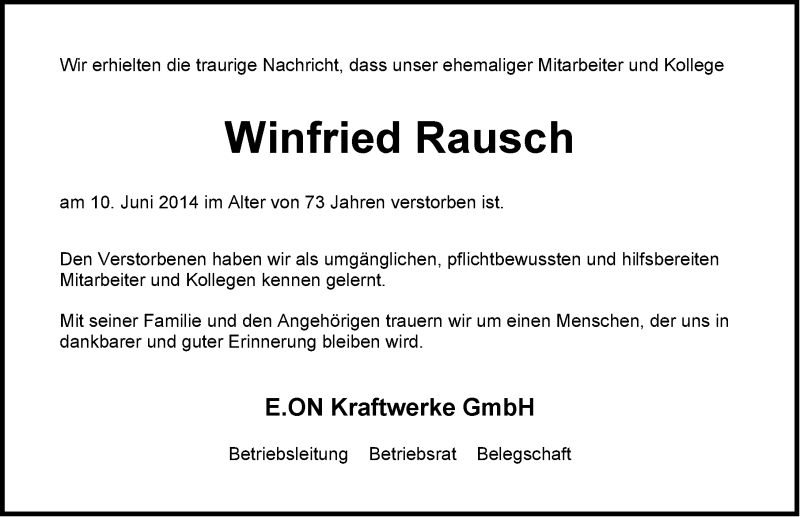 Hier finden Sie alle Traueranzeigen aus der Zeitung, die bisher für Winfried Rausch erschienen sind. Weitere Traueranzeigen, die in der Zeitung erscheinen, werden hier ebenfalls aufgelistet