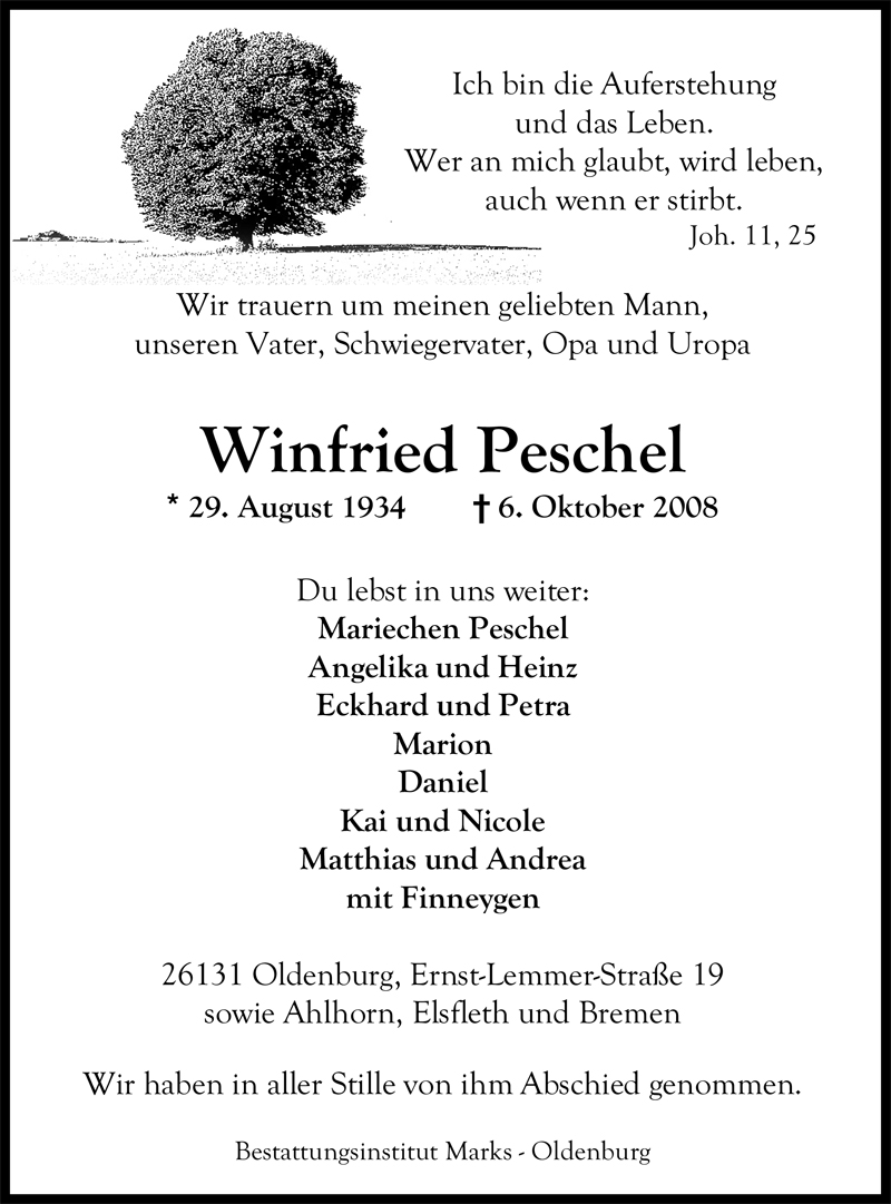 Hier finden Sie alle Traueranzeigen aus der Zeitung, die bisher für Winfried Peschel erschienen sind. Weitere Traueranzeigen, die in der Zeitung erscheinen, werden hier ebenfalls aufgelistet