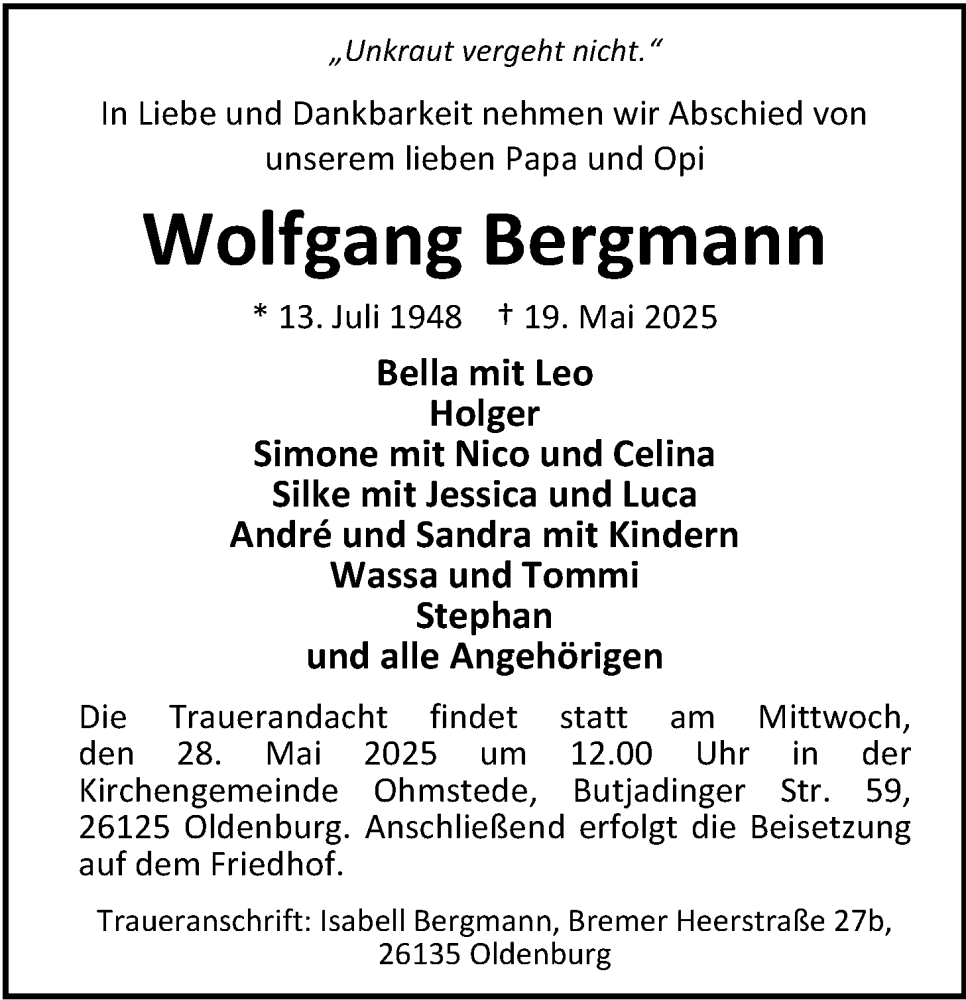 Hier finden Sie alle Traueranzeigen aus der Zeitung, die bisher für Wolfgang Bergmann erschienen sind. Weitere Traueranzeigen, die in der Zeitung erscheinen, werden hier ebenfalls aufgelistet