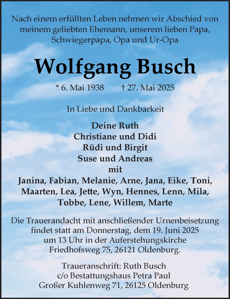 Hier finden Sie alle Traueranzeigen aus der Zeitung, die bisher für Wolfgang Busch erschienen sind. Weitere Traueranzeigen, die in der Zeitung erscheinen, werden hier ebenfalls aufgelistet
