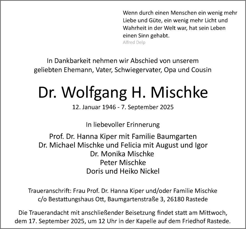 Hier finden Sie alle Traueranzeigen aus der Zeitung, die bisher für Wolfgang H. Mischke erschienen sind. Weitere Traueranzeigen, die in der Zeitung erscheinen, werden hier ebenfalls aufgelistet