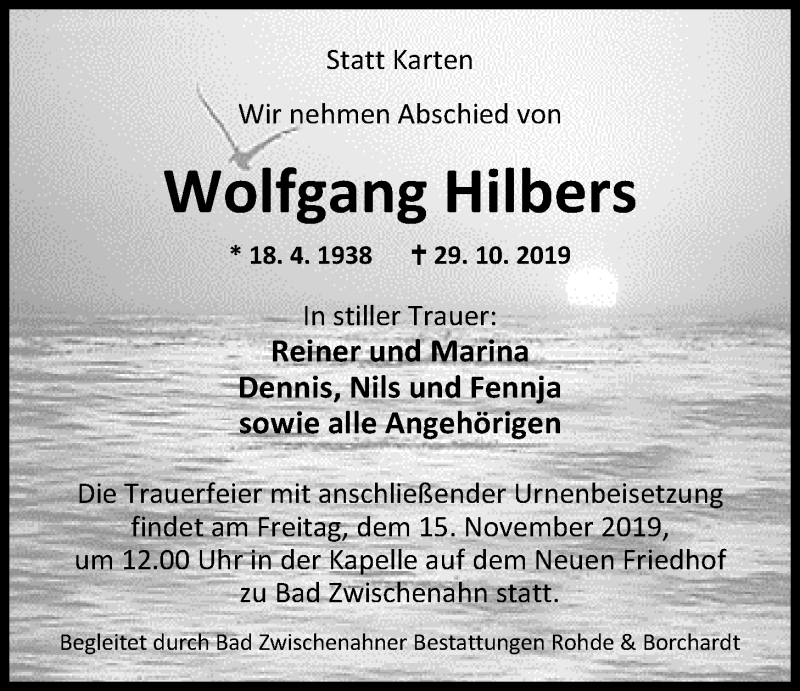 Hier finden Sie alle Traueranzeigen aus der Zeitung, die bisher für Wolfgang Hilbers erschienen sind. Weitere Traueranzeigen, die in der Zeitung erscheinen, werden hier ebenfalls aufgelistet