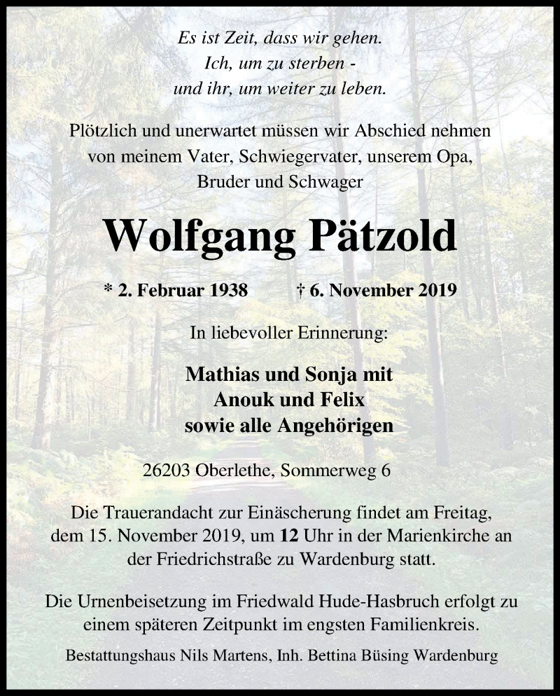 Hier finden Sie alle Traueranzeigen aus der Zeitung, die bisher für Wolfgang Pätzold erschienen sind. Weitere Traueranzeigen, die in der Zeitung erscheinen, werden hier ebenfalls aufgelistet